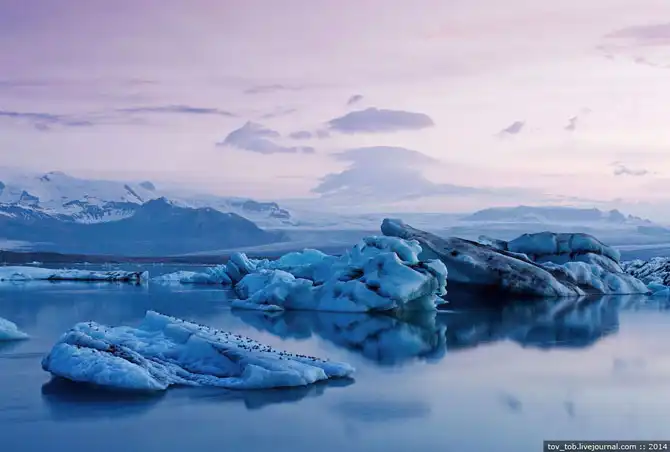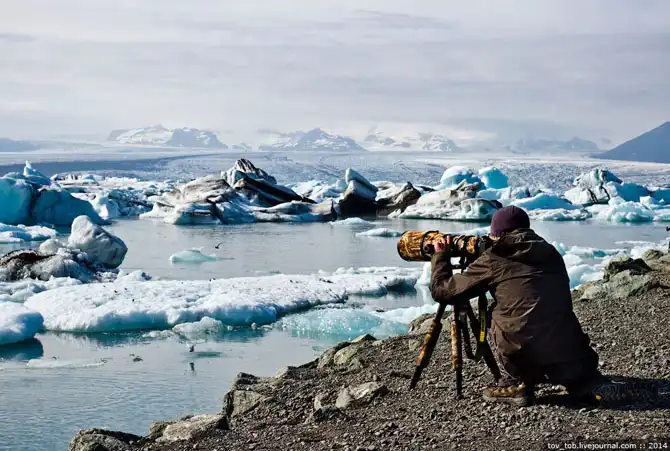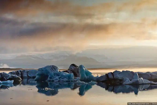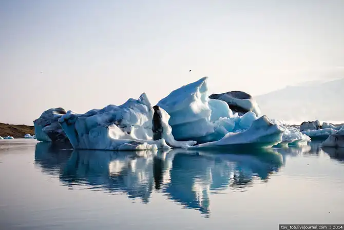 На заднем плане видно ледник, который постоянно подкармливает Лагуну льдом. С виду до него рукой подать — километр или два. На самом деле он находится на расстоянии более 6 км от берега океана. Глыбы льда, которые откалываются от ледника, достигают 30 м в высоту:
