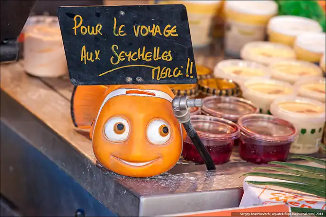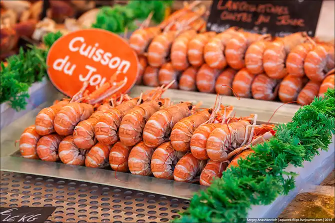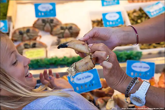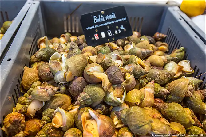 Кстати, рыбным этот рынок тоже можно назвать с натяжкой — рыбы здесь, конечно, не несколько видов, но в общем количестве продаваемой морской живности она занимает очень скромное место. Здесь правят балл десятки видов креветок и гребешки, лобстеры и лангусты, мидии, различные виды крабов, всевозможные улитки и, конечно же, устрицы.Устриц здесь вообще, как яблок, на севастопольском рынке — много и удивительно дешевые — от полуевро за штуку…