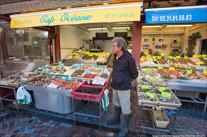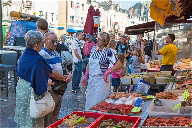 Только ради свежайших морепродуктов стоит заехать в прибрежные городки, если вы путешествуете по Нормандии! Кстати, на этом фото очень хорошо видно соотношение рыбы к не-рыбе на этом «рыбном» рынке