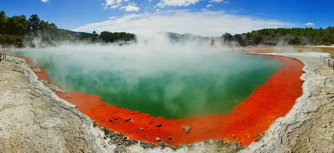 Мощная геотермальная деятельность в области создала массив горячих источников и грязевых луж вокруг Роторуа, Новая Зеландия. Обратная сторона всей этой геотермальной активности заключается в том, что она вызывает выбросы тяжелого сероводорода, который пахнет как тухлые яйца и заработала городу прозвище «Город Серы».