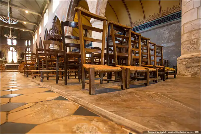 В церкви поразительные витражи на стеклах. Они мне показались даже более впечатляющими, чем фрески