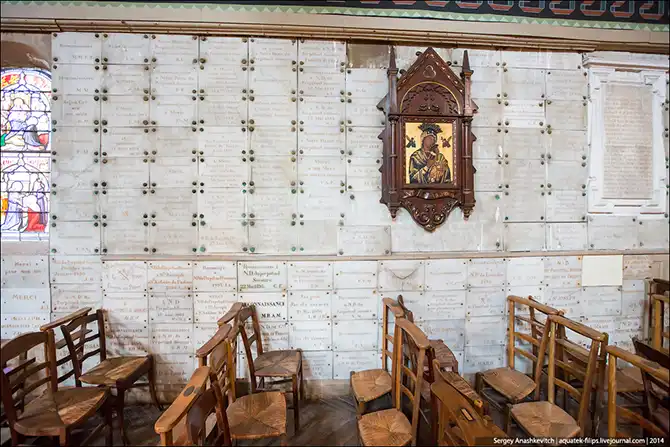 На табличках слова благодарности Деве Марии за помощь и выражение признательности по поводу исцеления и пр. Видимо, имеет отношение к пожертвованиям.