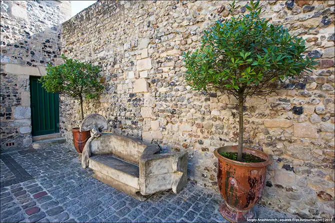 Дворик в старом городе и скамья, высеченная из цельного куска камня