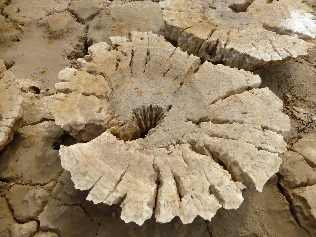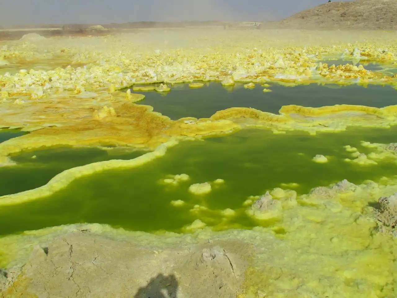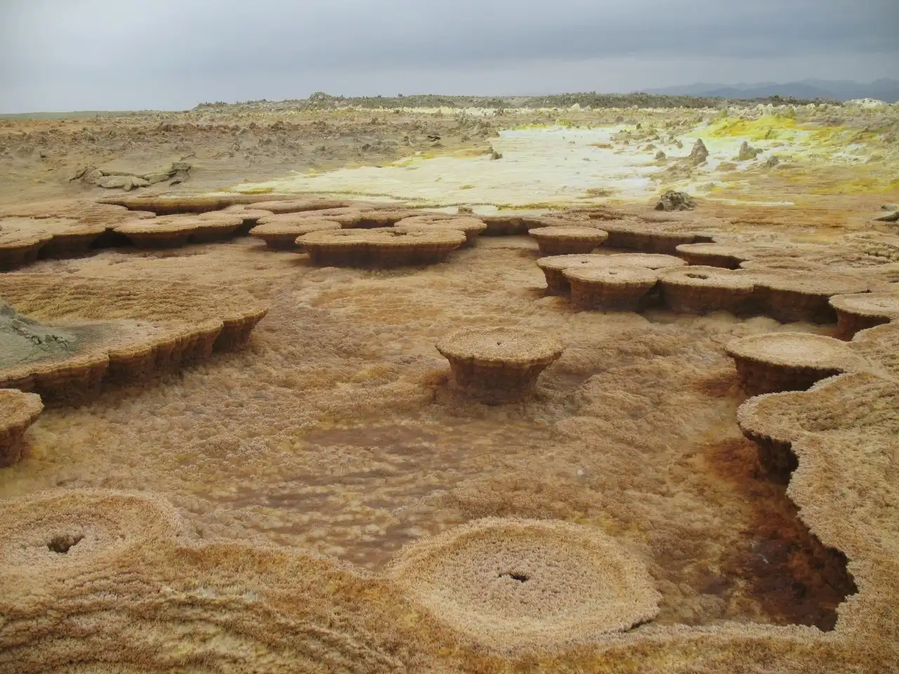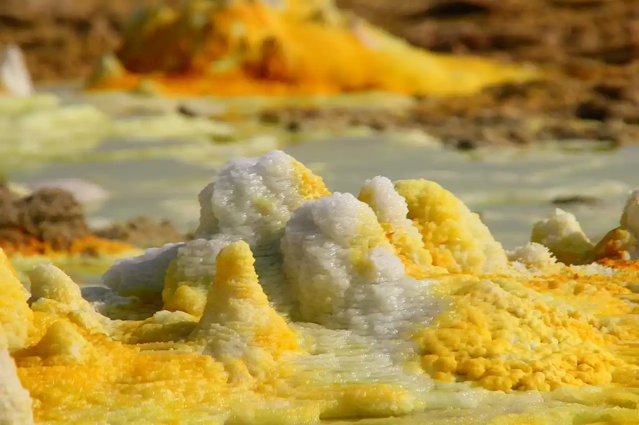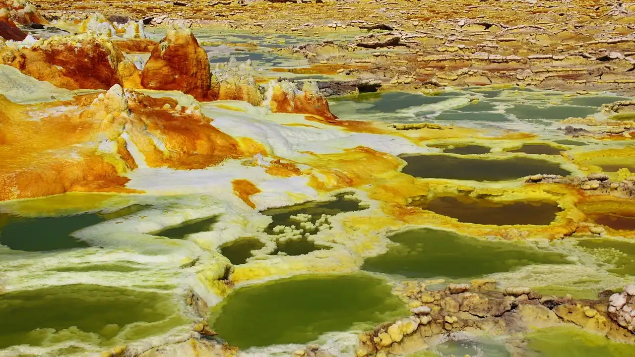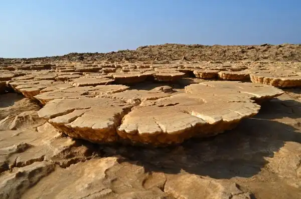 На поверхности можно увидеть кристаллы соли, которая вымывается из нижних слоев земли и транспортируется на поверхность геотермальной горячей водой. Эфиопы увозят отсюда целые плиты земной коры, состоящей из соли, чтобы позже продать ее для переработки в поваренную.