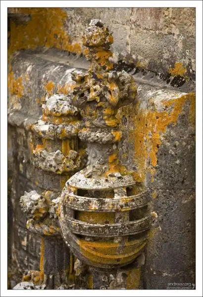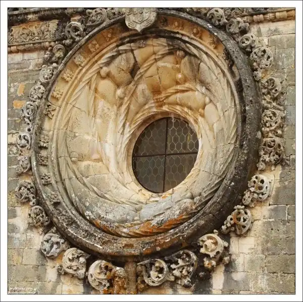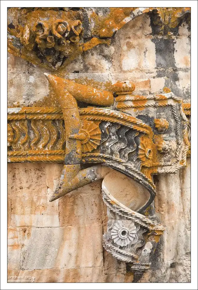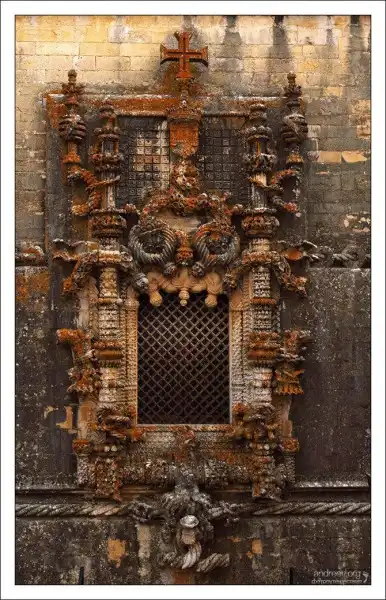 Широкую известность получило огромное прямоугольное окно в стиле мануэлино на западном фасаде монастыря: сколько там всего намешано! Венчают окно королевские символы и крест – символ ордена Христа.