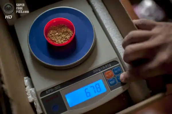 «Урожай» одного из фермеров-золотоискателей на весах в магазине Ковита Эва. На весенний сезон засухи Эв из простого продавца превращается в торговца золотом.