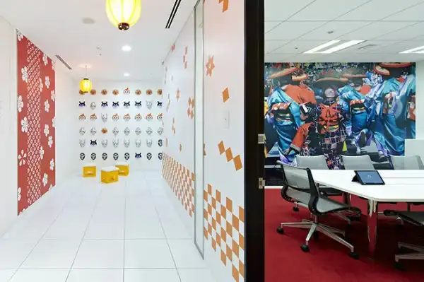 В уборных вместо зеркал висят компьютерные мониторы. Более того, согласно требованию руководства компании, каждый офис Google в новой стране должен непременно отражать ее особенности, национальные традиции и культуру. Архитекторы отказались от клише в виде анимэ, приняв решение в пользу цифрового пруда с карпами кои, напольная проекция которого встречает каждого, кто переступает порог офиса.