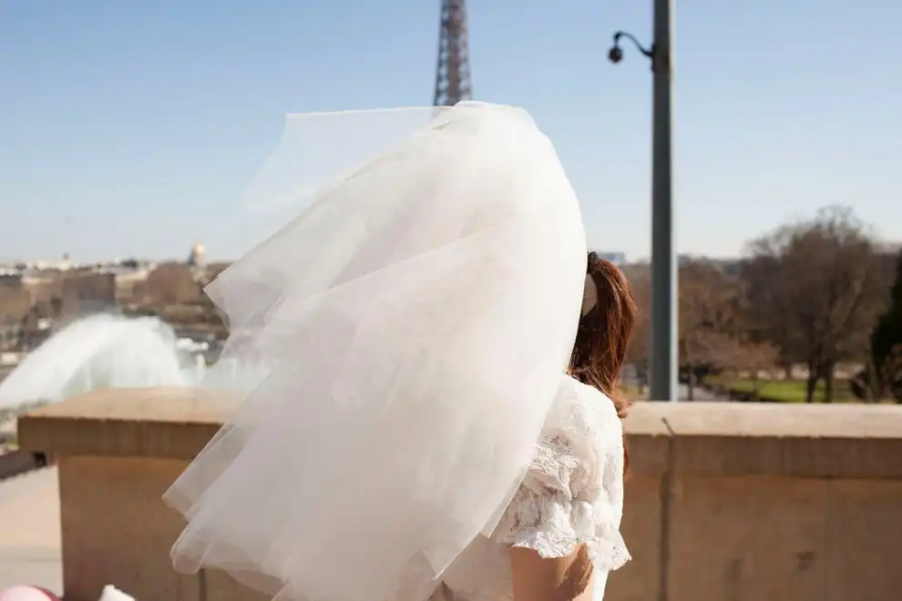 Певица Сохён в фате на Трокадеро в Париже, 20 марта 2014 года.