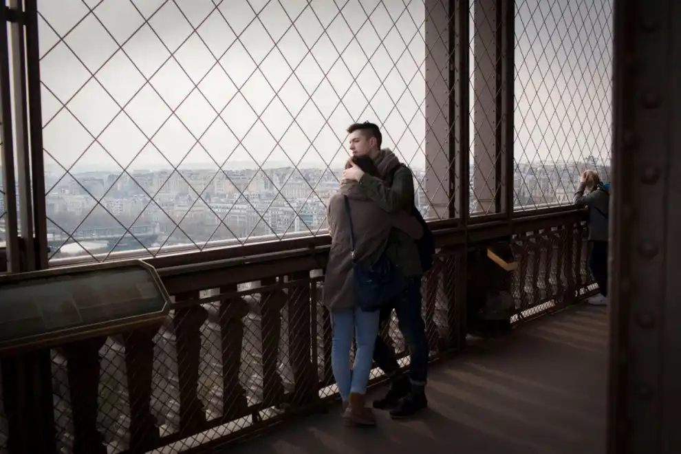 Влюблённые обнимаются на первой платформе Эйфелевой башни, 26 марта 2014 года.