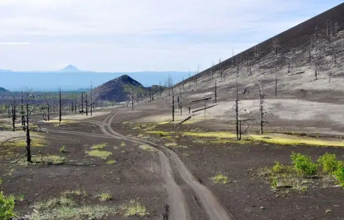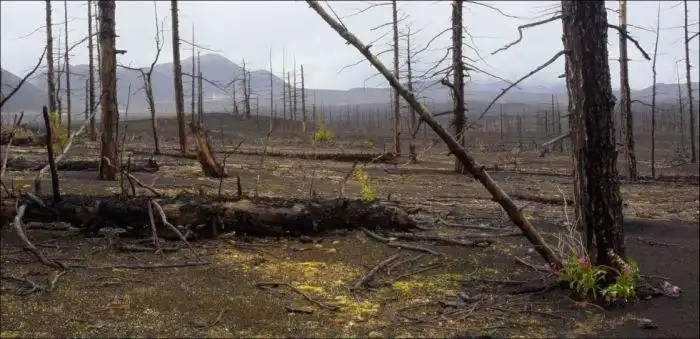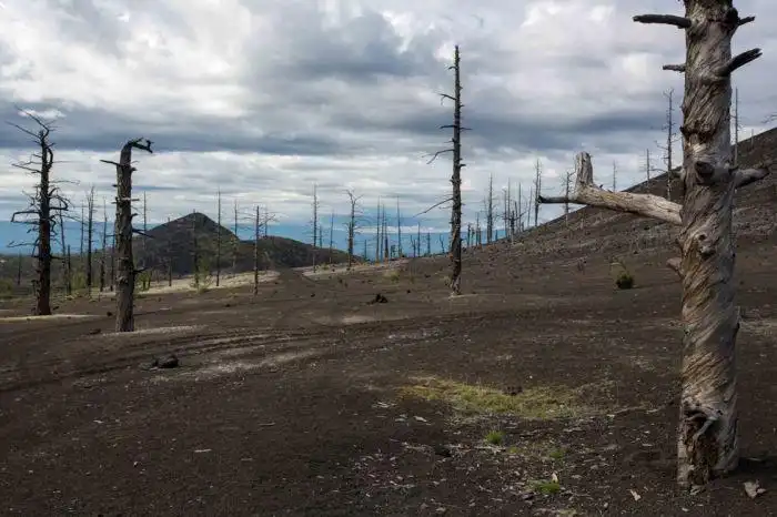 Несмотря на прошедшие после памятного извержения десятилетия, лес остается все таким же неживым. Но жизнь, все-таки, начинает понемногу побеждать последствия вулканической деятельности: на склонах то тут, то там можно увидеть пробивающуюся из-под шлака растительность, удивляющую ярким изумрудом мха и красными вкраплениями таежных ягод.