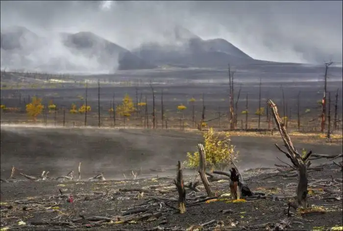 Свой сегодняшний пугающий вид эта местность приобрела в результате Большого трещинного извержения вулкана Толбачик, начавшегося в 1975 году. Вулкан не успокаивался полтора года, и за это время некоторая часть тайги была буквально сожжена горячей лавой. Но были и территории, которые не пострадали от раскаленной лавы, но оказались полностью засыпаны пеплом и шлаком.