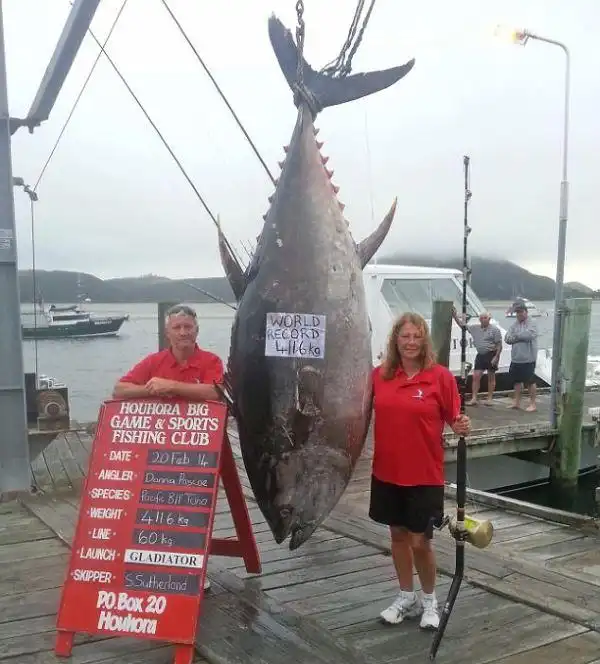 Женщина опередила мужиков, поймав самую большую рыбу! Гигантский тунец весом 411,6 кг был пойман в Новой Зеландии. Донна Паскуа (56 лет) вытащила рыбку, оцененную в $2,02 миллиона.