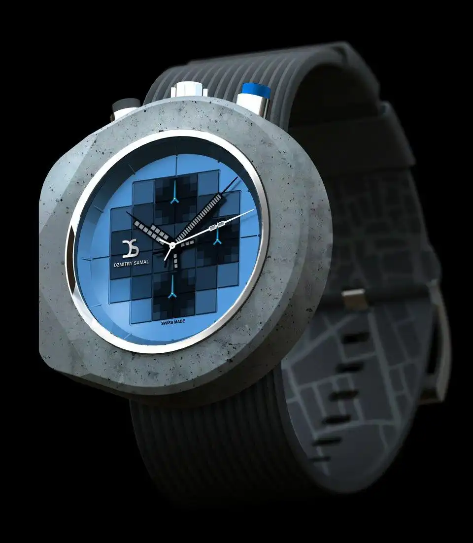 Промышленный дизайнер Дмитрий Самаль (Dzmitry Samal) живет и работает в Париже. Концепт его часов носит статус первых в мире наручных часов из бетона и стали. Кварцевый механизм из Швейцарии закрыт от внешних воздействий бетонным корпусом и сапфировым стеклом. Три пары стрелок хронографов приводятся в движение и регулируются кнопками в верхней части корпуса.