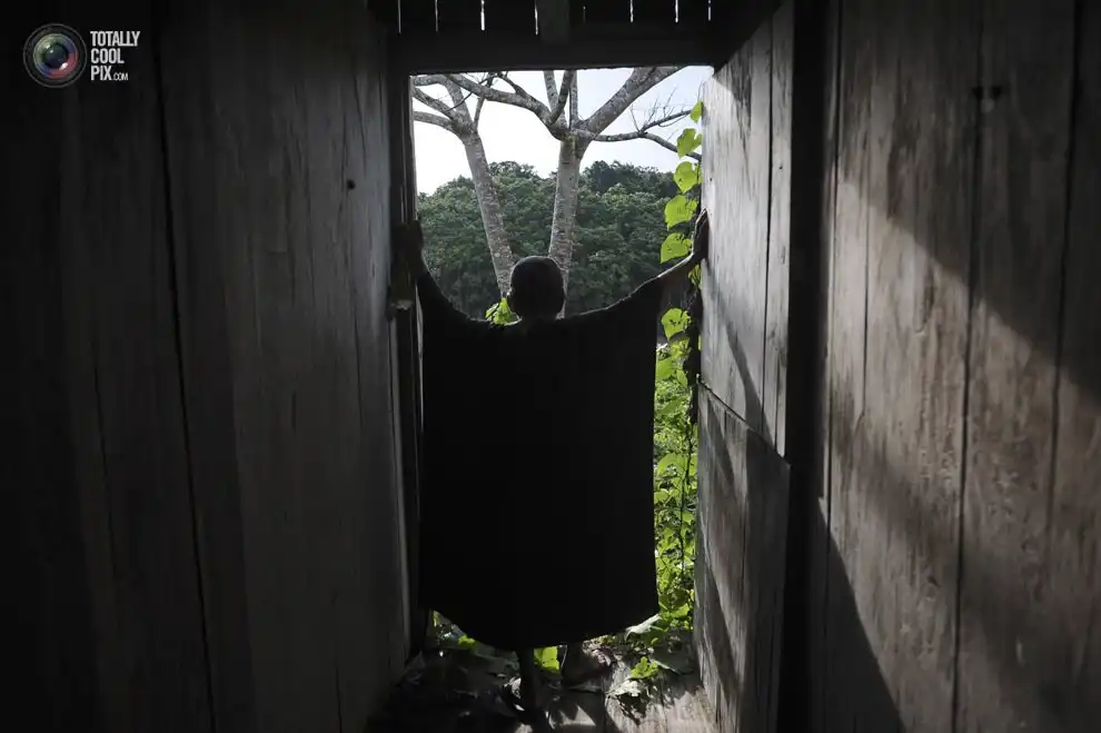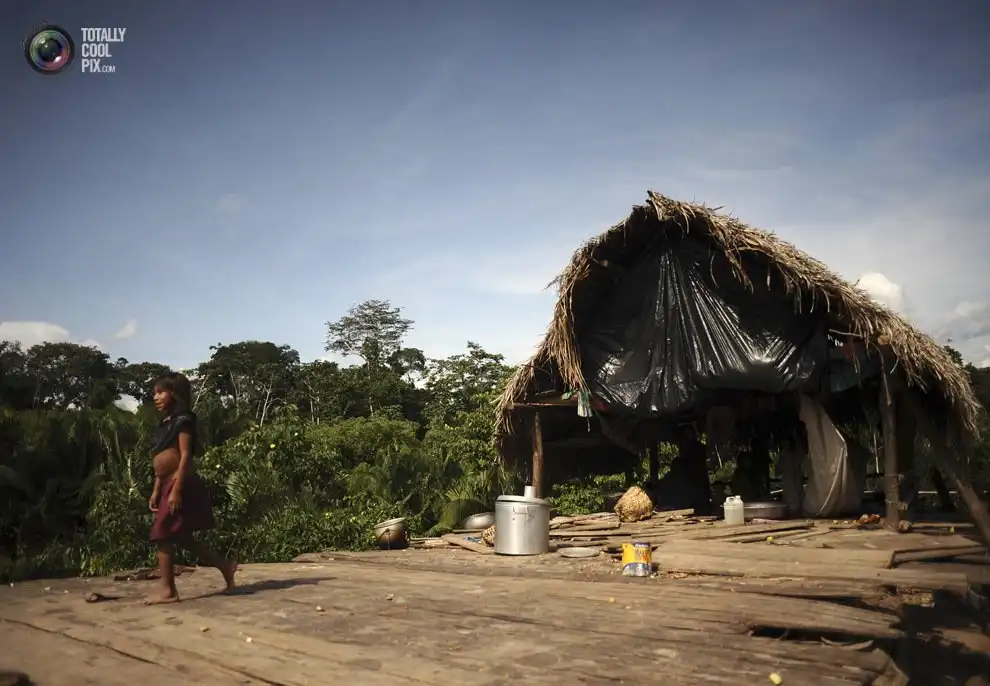Девочка мадиха выходит из хижины в деревне Дсама, на которую часто совершают набеги неконтактные индейцы, на берегу реки Энвира в штате Акри, Бразилия.