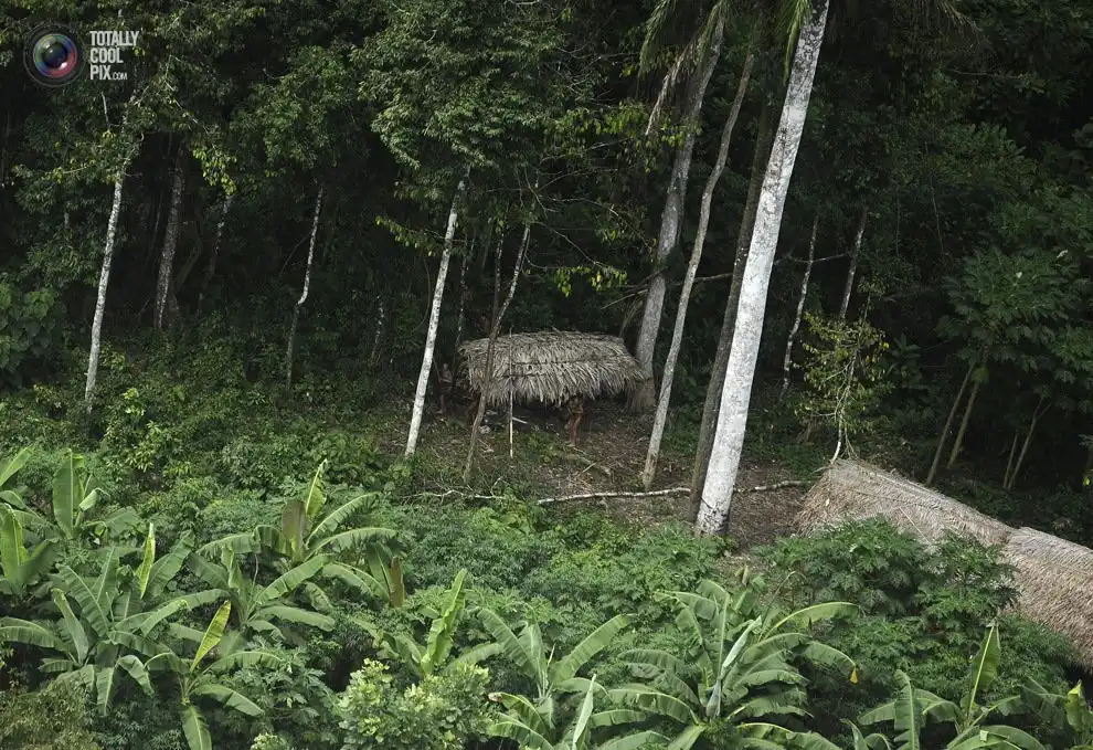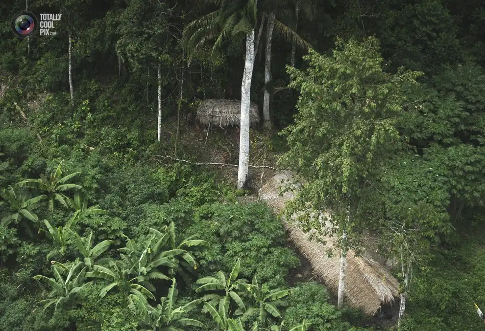 Неконтактные индейцы смотрят на самолёт, пролетающий над их селением в Амазонской низменности.