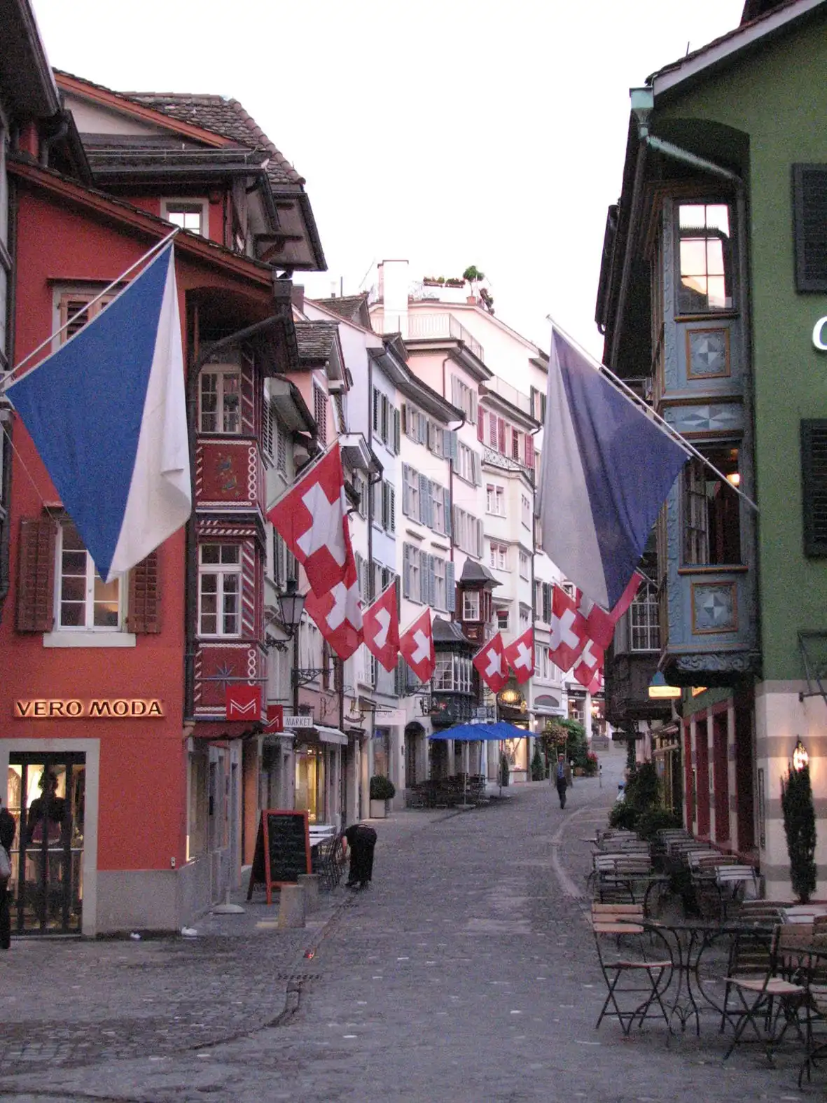 В Цюрихе, как и во многих других Швейцарских городах, много уютных маленьких двориков. Во двориках с видом на другой берег реки собираются под вечер полюбоваться на закат…