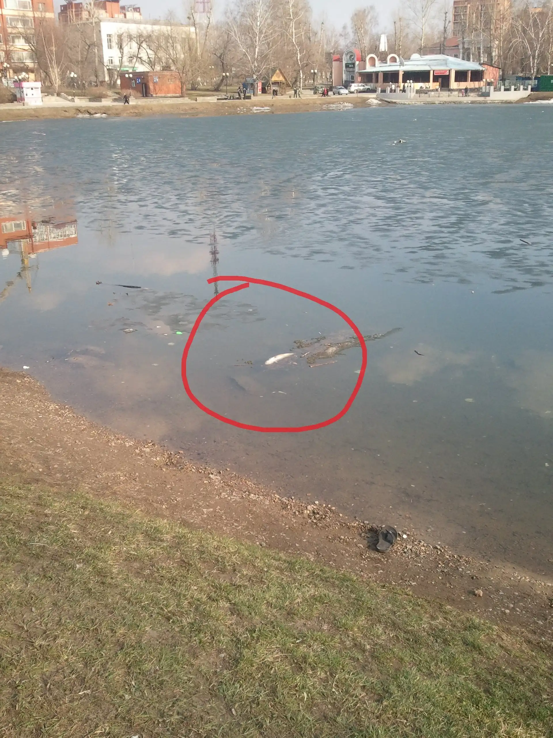 А что не так? Рыба подо льдом задохнулась скорее всего. Озера в городе - это грязные лужи, речки - сточные канавы, так всегда было и еще долго будет, ибо Россия.