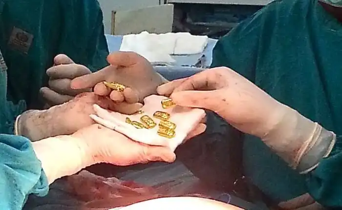 Во время операции хирурги извлекли из желудка бизнесмена 12 золотых слитков весом в 400 грамм (14 унций). Врачи тут же вызвали милицию и таможенников, которые прямо в больнице конфисковали драгоценные находки.