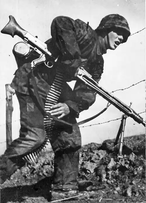 Немецкий мальчик-солдат с "Ofenrohr" (ручным противотанковым гранатометом ) и ручными гранатами. Франция 21 июня 1944г.