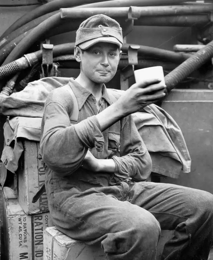 Захваченный в плен немецкий мальчик солдат наслаждается чашечкой кофе на борту катера береговой охраны США LCI, побережье Нормандии, 1944г.