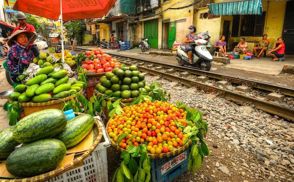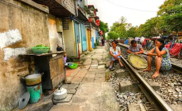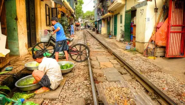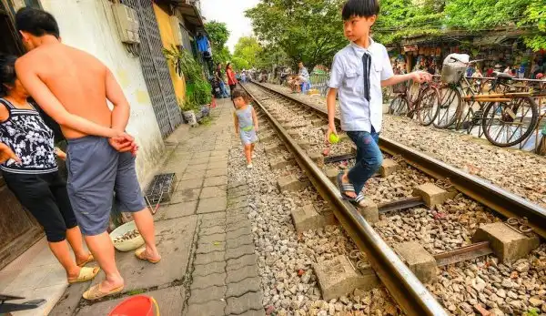 Железнодорожная линия в Ханое – столице Вьетнама – находится так близко к магазинам и домам, что огромные поезда буквально вынуждены «протискиваться» сквозь толпы детей, которые играют на рельсах и торговцев, которые торгуют вблизи пути.
