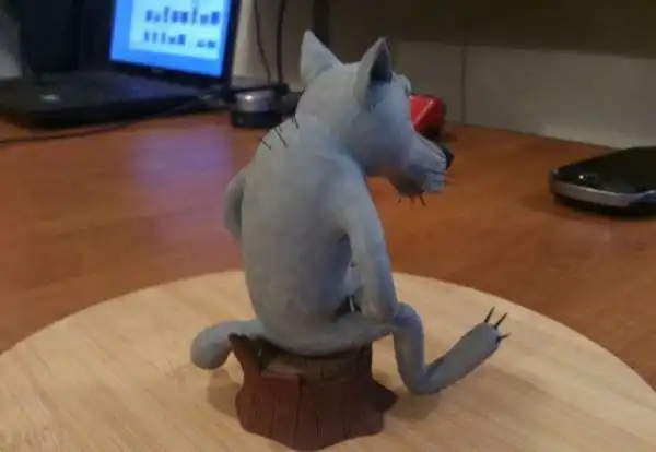 На этой фотографии пень уже запечён. Он твёрдый и на него можно для примерки усадить волка. Если обратите внимание, то пень стал ниже. Пришлось отпилить 3-4 миллиметра снизу. А то получалось, что волк некрасиво сидит. Прицепил голову и примеряю нижние лапы. Голова без глаз специально, потом буде удобно влепить в выемки какие угодно глаза.