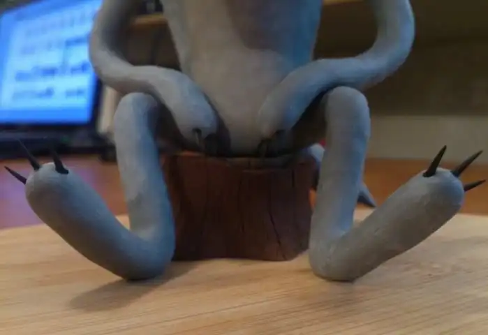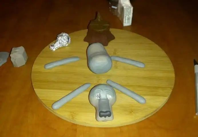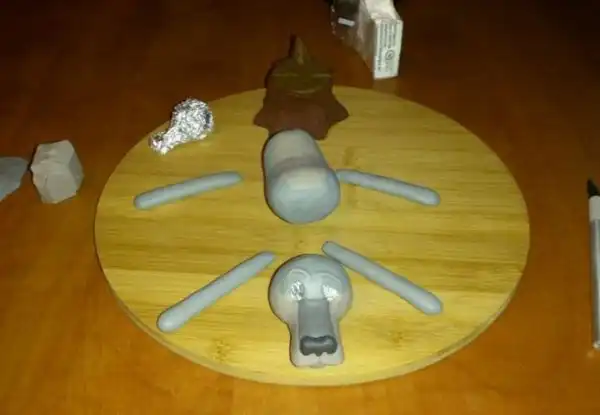 Выбрав окончательную позу и приделав все части (все лапы, уши, складки на лбу, глаза и хвост) усаживаю волка на кусок фольги под высоту пня. Так он запечётся и потом будет идеально сидеть на родном пне. В морде проделал отверстия для усов, также сделал на горбу. Если присмотреться, то в мульте у него на горбу тоже волосы торчат. Для когтей в лапах тоже сделал отверстия. Так гораздо удобней прикреплять когти.