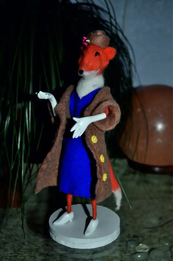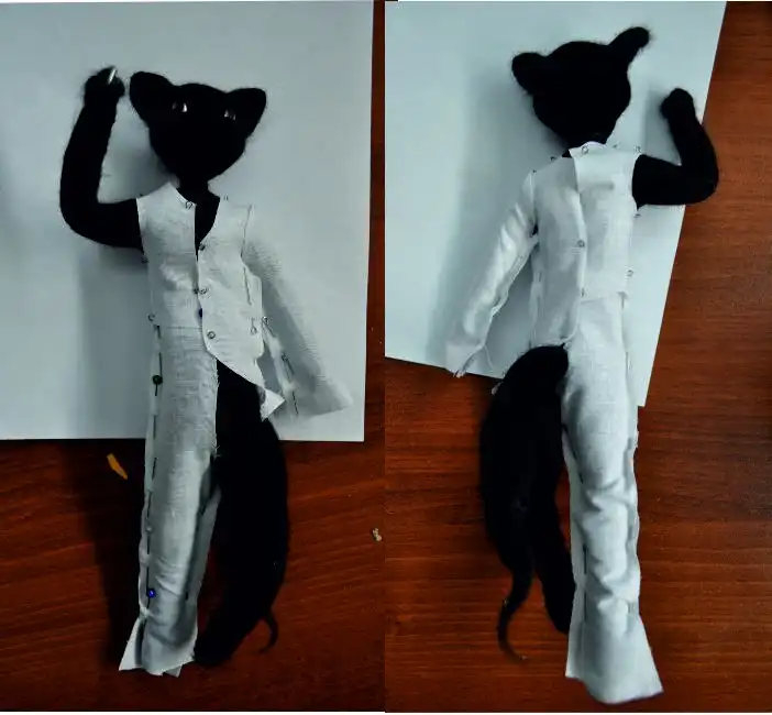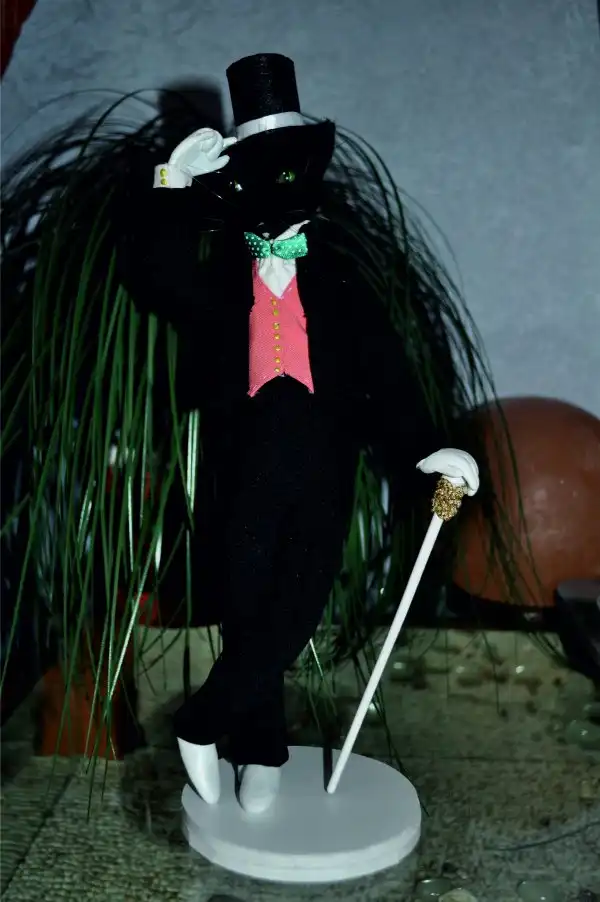 Простите за отсутствие промежуточного показа. Одежда сшита в ручную из габардина, цилиндр на бумажной основе обернутой габардином и покрашен, трость из сломанной кисточки и большой бусины, все окрашено акриловой краской. Шерсть обработана до состояния валенка)