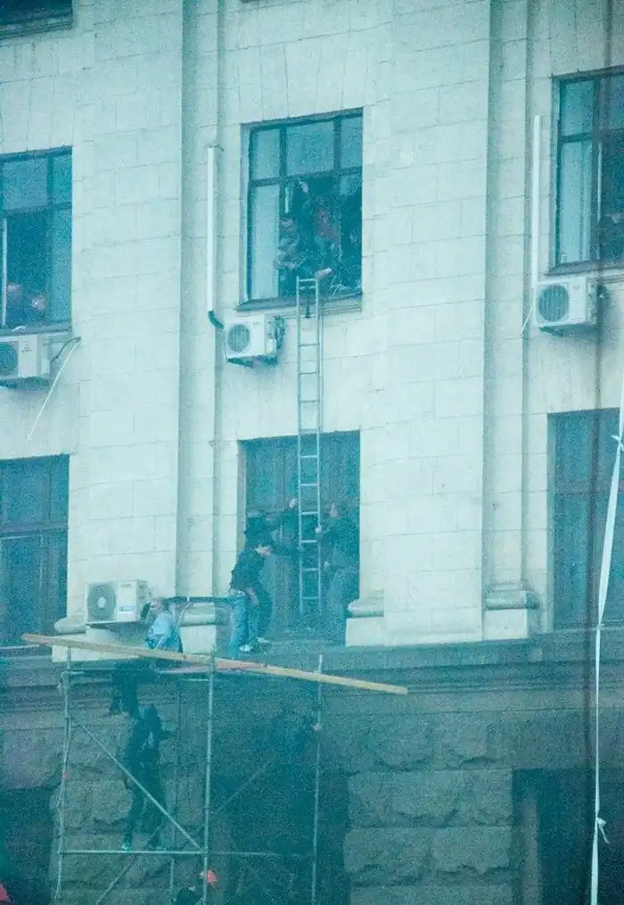Во время пожара в здании Одесской областной федерации профсоюзов по ул. Куликово поле очевидцы происходящего принимали любые попытки, чтобы помочь людям, оказавшимся в пылающем здании. Таким образом, который вы увидите в продолжении поста, была сооружена лестница, позволившая спускать людей со второго этажа Одесской областной федерации профсоюзов.