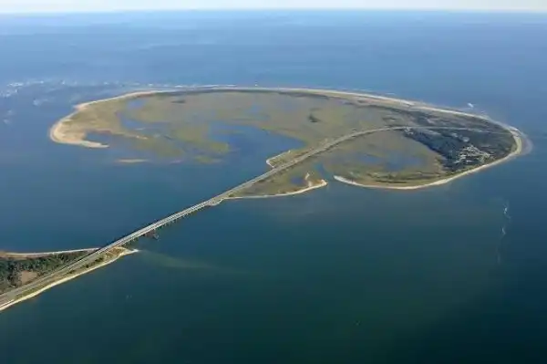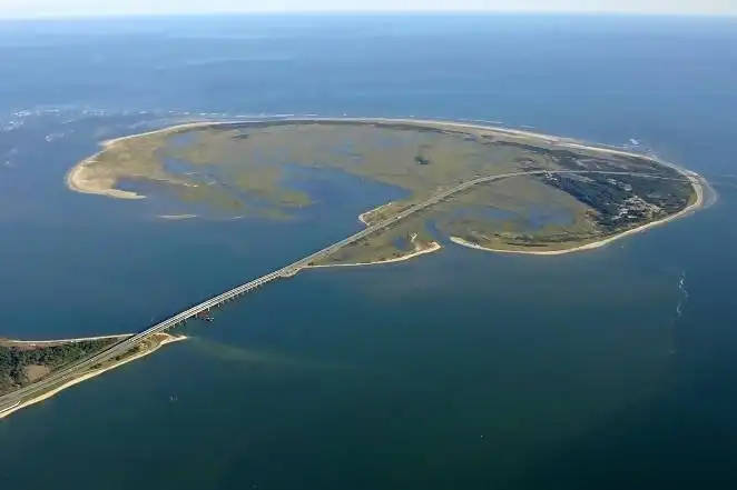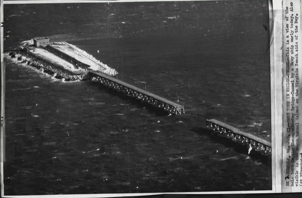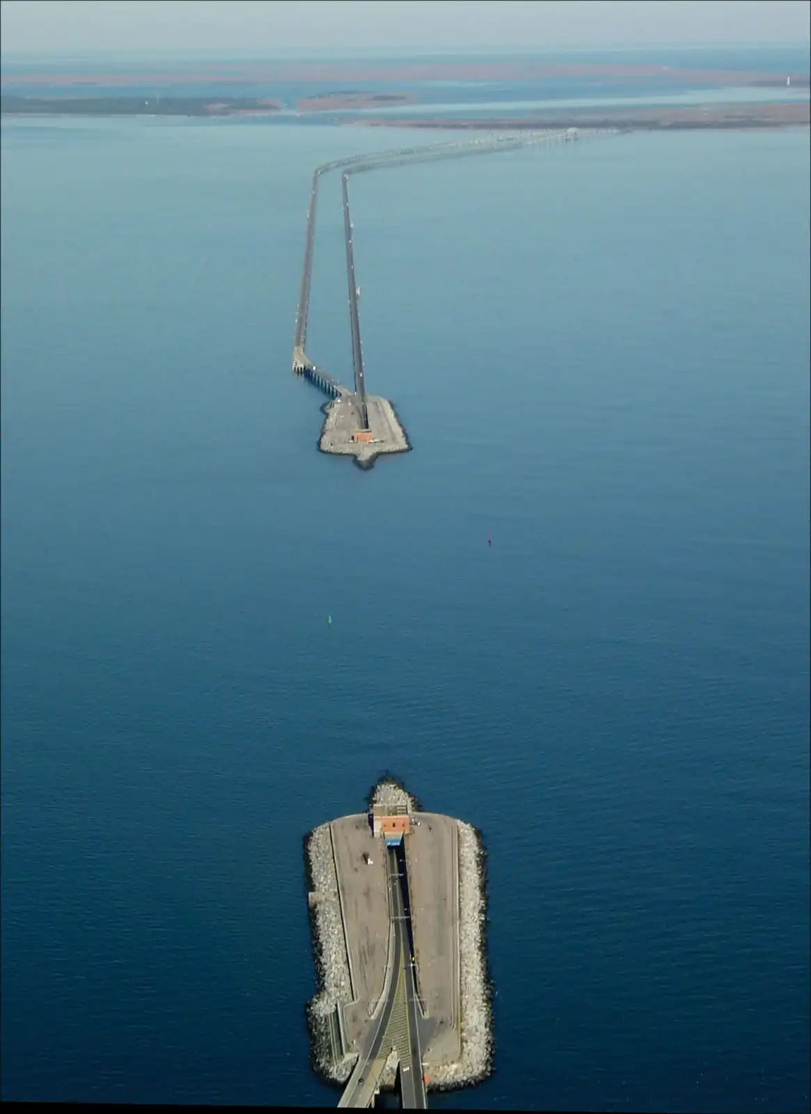 Chesapeake Bay Bridge-Tunnel (CBBT) (Чезапикский мост-туннель) соединяет Cape Charles (крайнюю южную точку длинного полуострова на этой карте) и Virginia Beach. Протяжённость сооружения - 17 миль. Он же на Google maps.