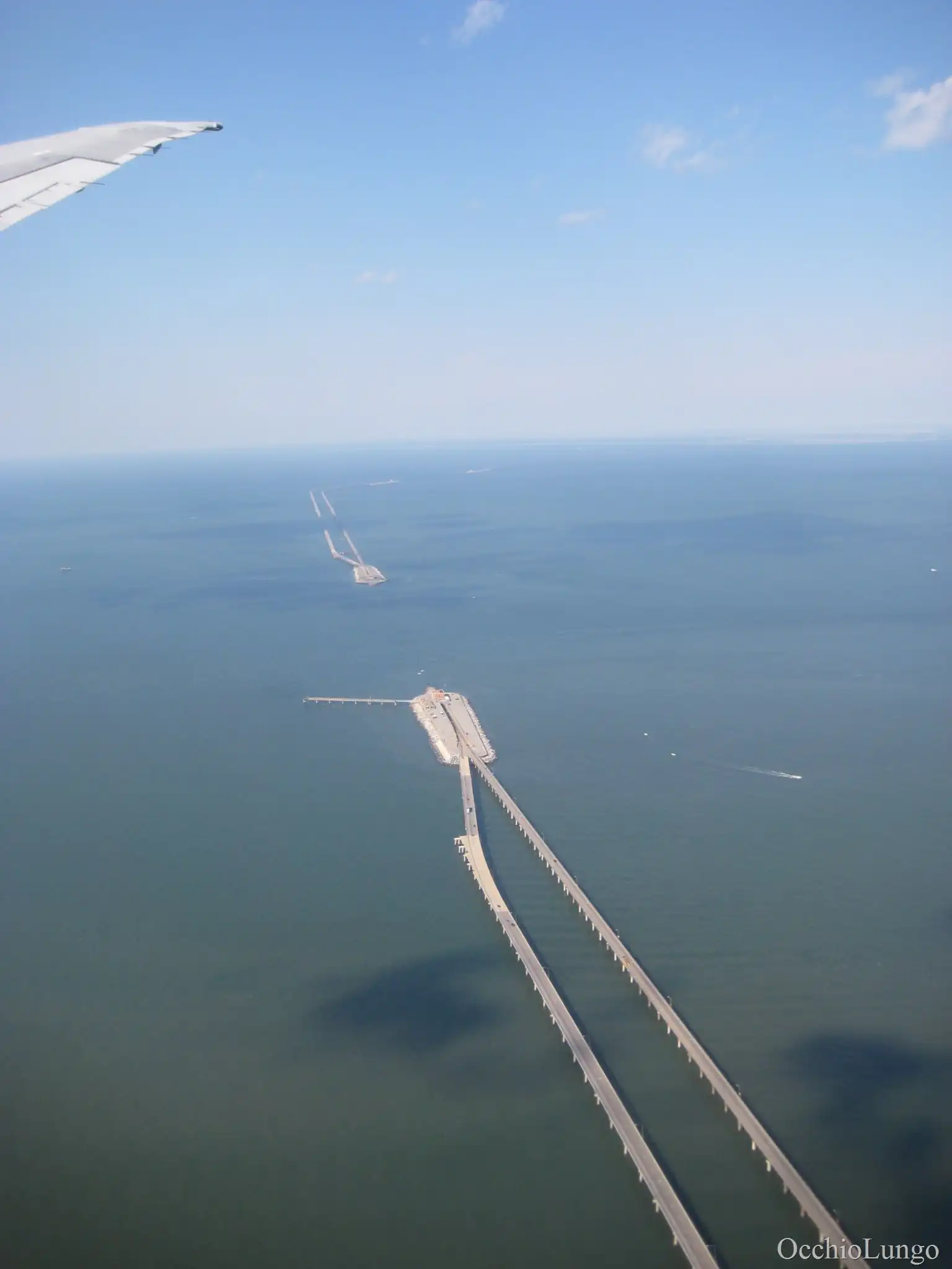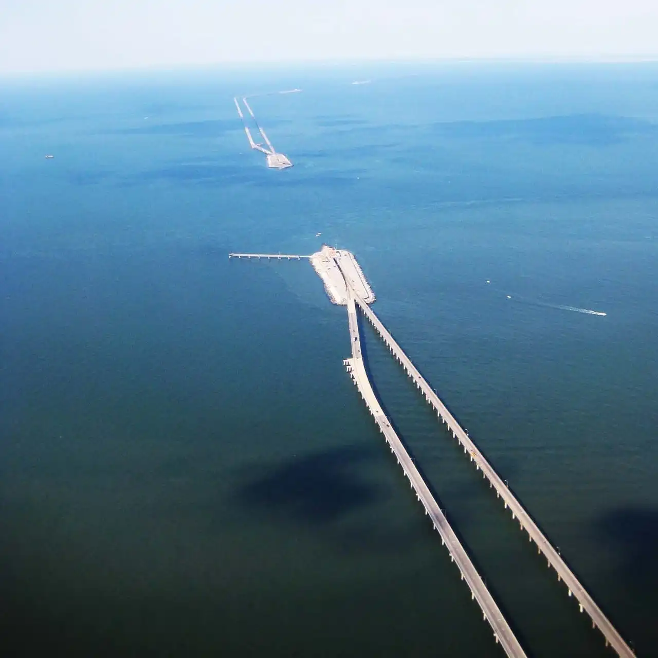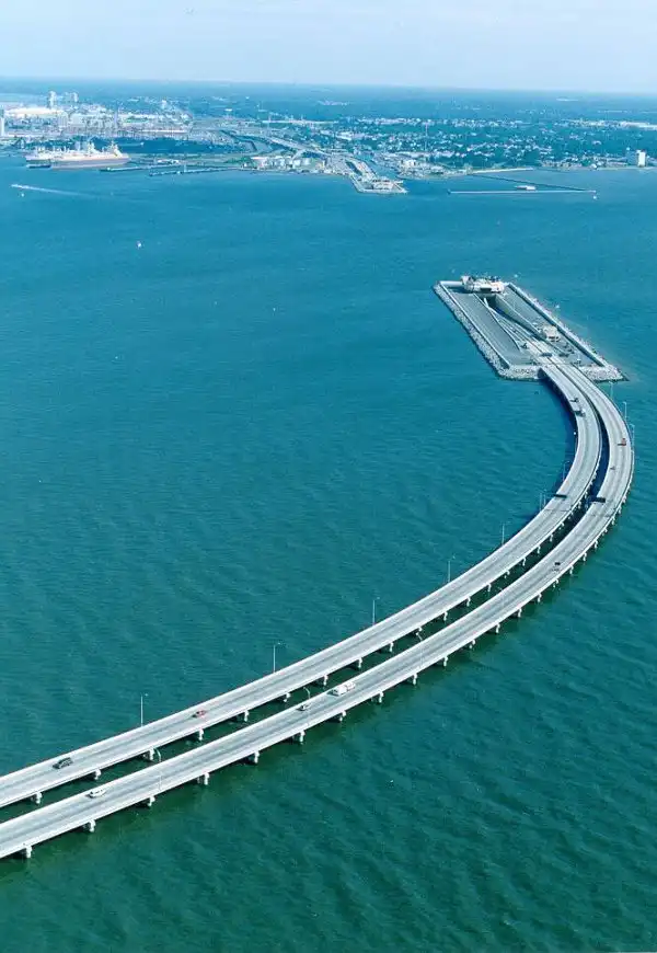 Что это – мосто-туннель или туннеле-мост? Скорее – мосто-туннель, так как надводная часть у него длиннее подводной. Длина – 37 км. Сооружение проходит через два канала и четыре острова. Инженерная находка, на которую потратили 200 млн. долларов, заключается в том, что мост через Чесапикский залив в штате Вирджиния уходит под землю на одном из искусственных островов и выходит наружу на другом через 5,423 км. Таким образом, переправа не мешает движению морского транспорта, а на одном из островов организована удобная площадка для ловли рыбы, рестораны и магазины подарков – многие местные приезжают на остров просто провести время. Мосто-туннель сократил путь из пункта А в пункт Б на 152 км и 1,5 часа.