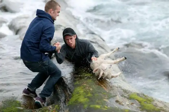 Простые парни рисковали жизнью, чтобы спасти упавшего в воду ягненка.