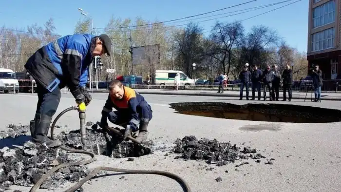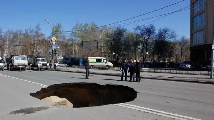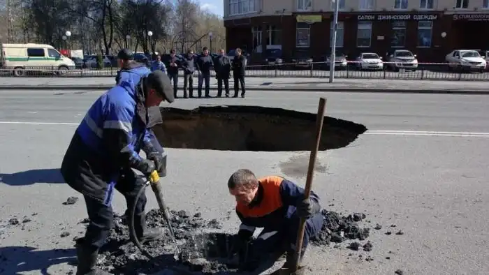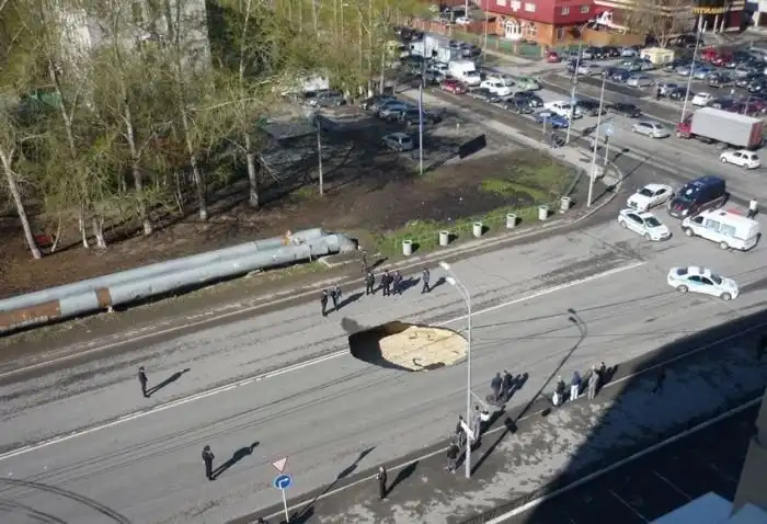 Вчера я вам уже показывал видеоролик, на котором видно, как образовалась эта огромная дыра посреди проезжей части, а сегодня я хочу показать вам небольшой фотоотчет с места происшествия. Итак, произошло это в Тюмени, неподалеку от перекрестка ул. Харьковской с ул. Одесской. Заместитель главного инженера "Тюмень водоканал" уже заявил, что причиной обрушения грунта стал обвал канализационного коллектора диаметром в 1000 мм. Глубина провала составляла почти 6 метров, а помогло разрушению то, что землю размыло после сильного и продолжительного дождя.