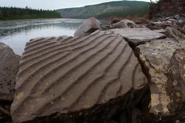 Следы характерной морской ряби древнего мелководного океана можно встретить на плитах красных, красно-бурых и фиолетовых песчаников, многометровыми толщами, возвышающимися по берегам рек, бегущих с горного плато. Их возраст более 2-х млрд лет.