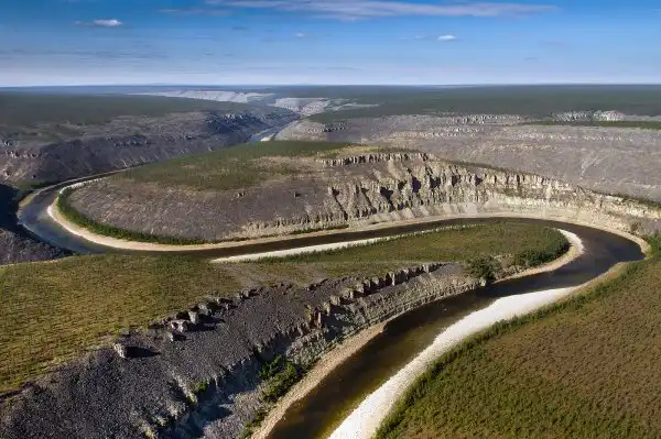 Плато Анабар – одно из самых труднодоступных и экологически чистых мест в России. Благодаря исключительной удаленности эта горная страна сохранила поистине девственный ландшафт. На сотни километров вокруг нет населенных пунктов, здесь можно встретить только немногочисленных туристов, предпочитающих отдых в самых удаленных безлюдных местах, а также охоту и рыбалку, которые здесь отменные. В реках на плато Анабар, в частности в Котуйкане, водится таймень – самый крупный представитель семейства лососевых. Иногда попадаются экземпляры весом более 20 килограммов. Но таймень – краснокнижный вид, поэтому обычно его ловят, взвешивают, фотографируются с ним и отпускают. На самом деле эта рыба по своим кулинарным свойствам сильно уступает тому же хариусу и сигу, которые ловятся легко, но людьми движет спортивный интерес. Потому что таймень – рыба большая и сильная, она борется, вырывается, ее тяжело вытащить, от этого получаешь сильный всплеск адреналина.