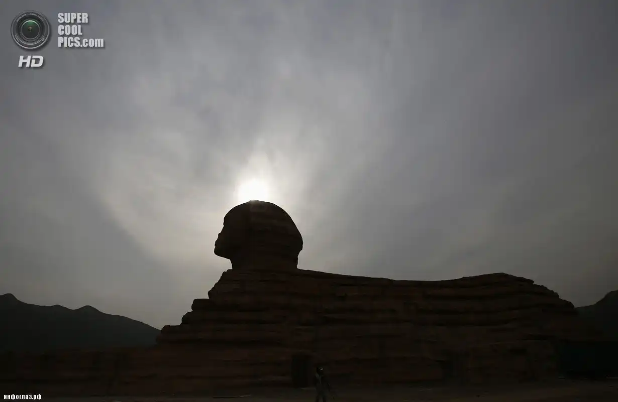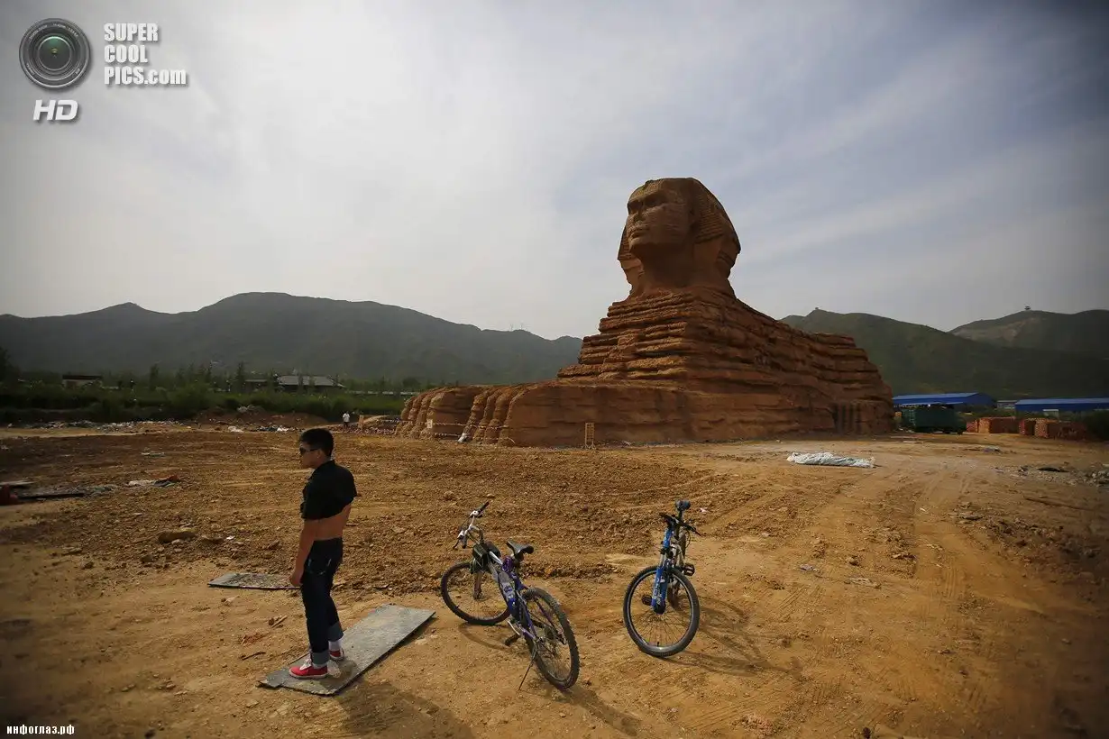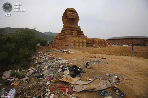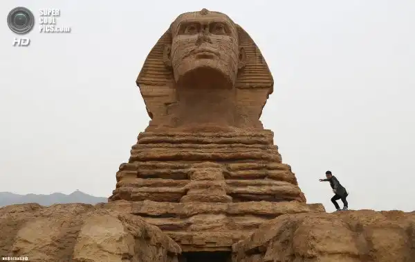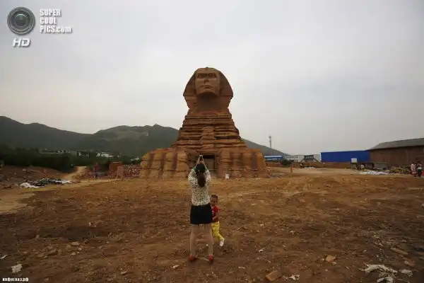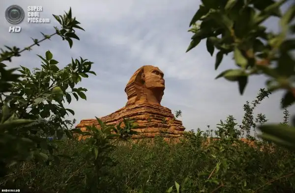 В китайской провинции Хэбэй появилась полноразмерная и достаточно точная реплика Большого Сфинкса — скульпторы даже нос отломали согласно оригиналу. Вот только в качестве строительного материала использовался не известняк, а железобетон. На всю работу у китайских мастеров ушло всего два месяца.
