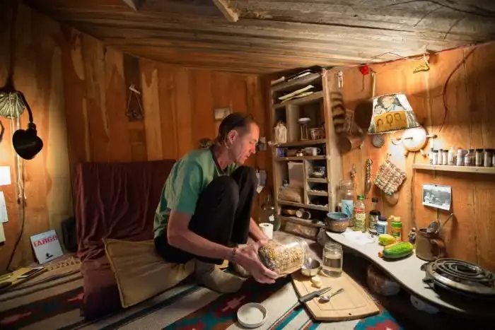 Присев на корточки, Дэн Прайс забирается в свой дом – в “Нору Хоббита”, как он его называет. Нора – потому что дом сделан самим Дэном внутри холма, с помощью древесных отходов. «Хоббит» живёт в городке Джозеф, что на северо-востоке штата Орегон. На всю постройку ушло всего лишь 75 долларов, большая часть из которых потрачена на скобы и строительный наполнитель. Внутри – комнатка высотой в 1,3 метра с покатым потолком. «Всё, что мне нужно – это еда, одежда и крыша над головой», – говорит Прайс, который живёт всего на пять тысяч долларов в год. Такой уклад жизни, со слов самого Дэна, избавил его от постоянной заботы о деньгах и работе.