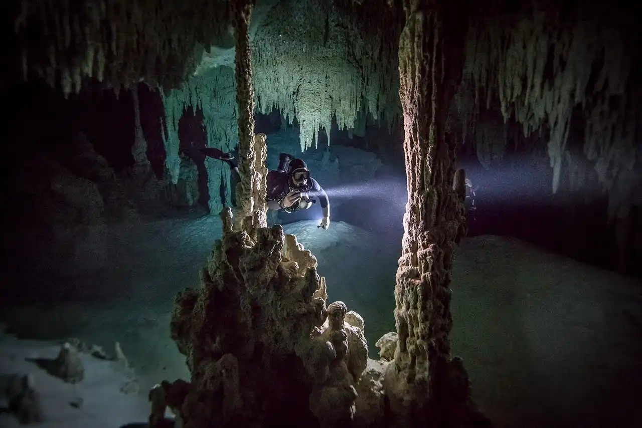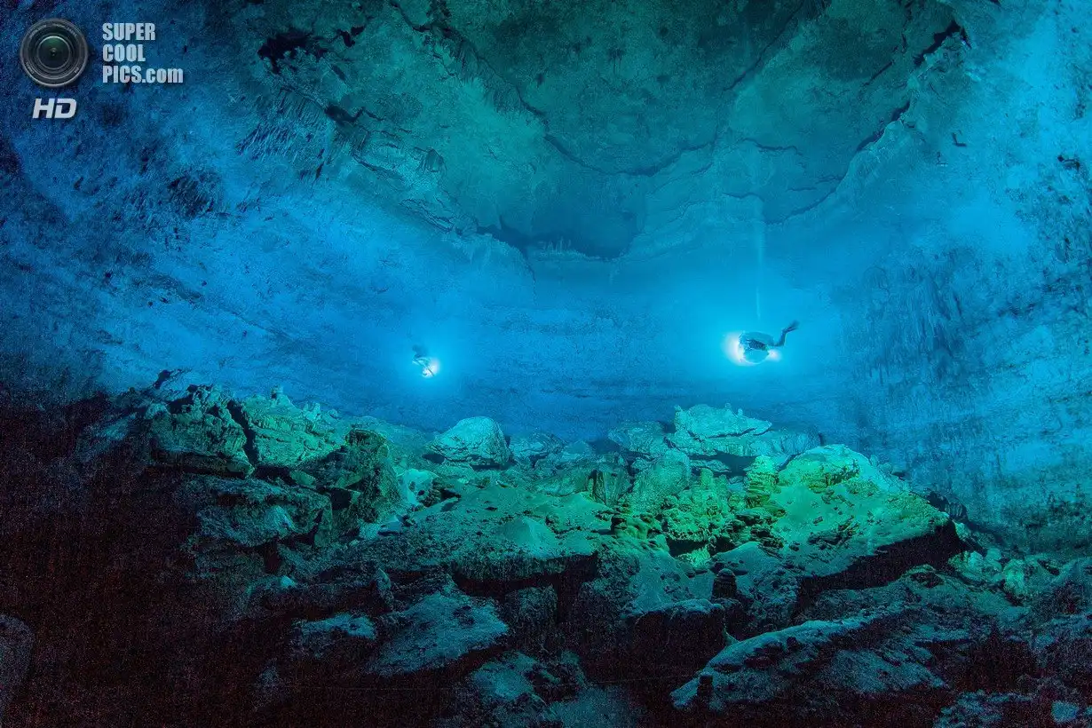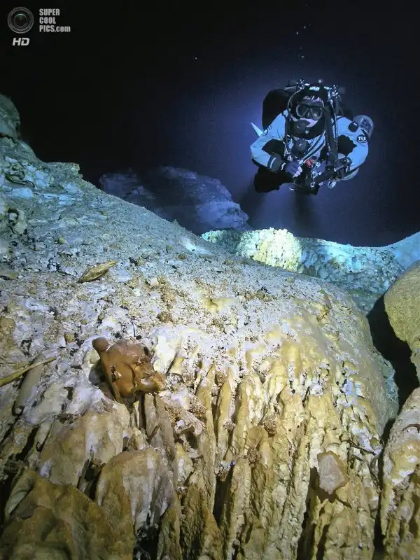 Мексика. Сак-Актун, Юкатан. Дайвер указывает лучом света на находку.