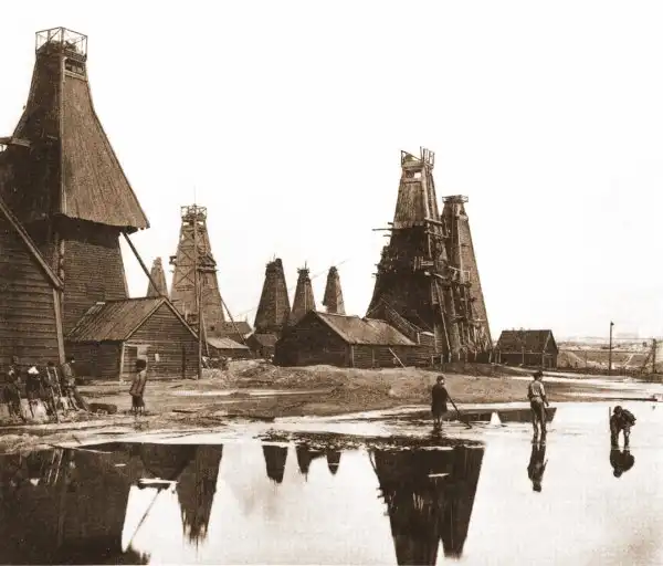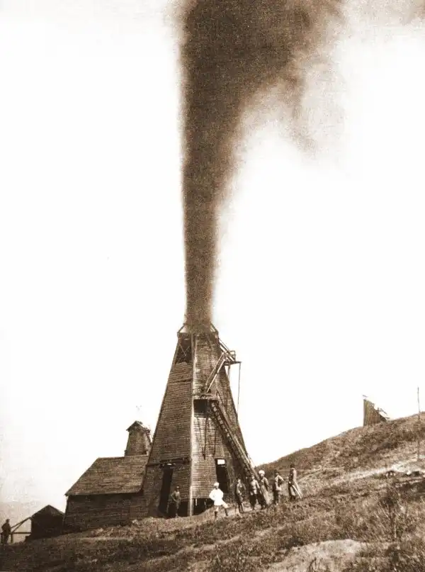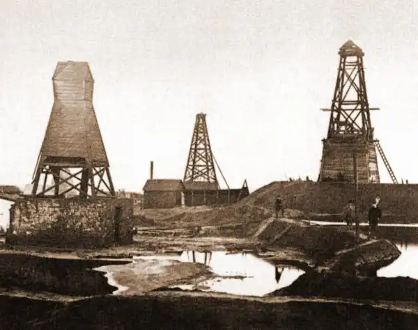 Технология бурения предусматривала, что нефть бьёт из земли, пока не зальёт всё вокруг, фонтан не иссякнет, а потом собирали нефть чуть ли не тряпками в вёдра и бочки.