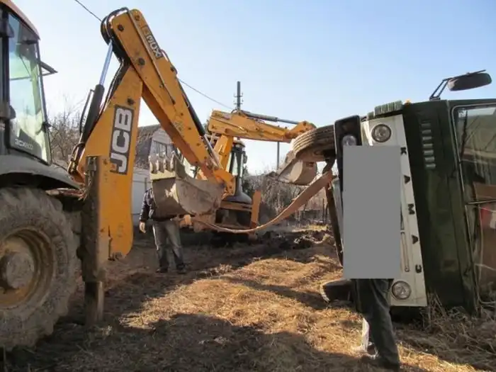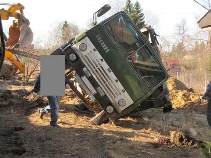 Йоб! Мы к водиле - как ты там чувак? Жив? Эй? Ёманарот! Жив вроде. Ни царапины. Ну ты на напугал! У жены истерика. Завтра чуваки приезжают септик закапывать, трубу канализационную прокладывать согласно проекту на этом месте, а тут Камаз устал - спит на боку.