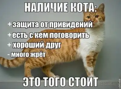 Котейка - это жирный плюс !!! Но минусов тоже многовато: порванные шторы, изгрызенные провода, гонки по ночам, прыжки, с*ка, ночью на пузо, дикое мяуканье зимой с балкона (похоже, у меня котэ-морж, хрен ее знает, зачем она зимой туда вылетает, когда я за водкой на балкон лезу). Но все равно котейки - это здорово !