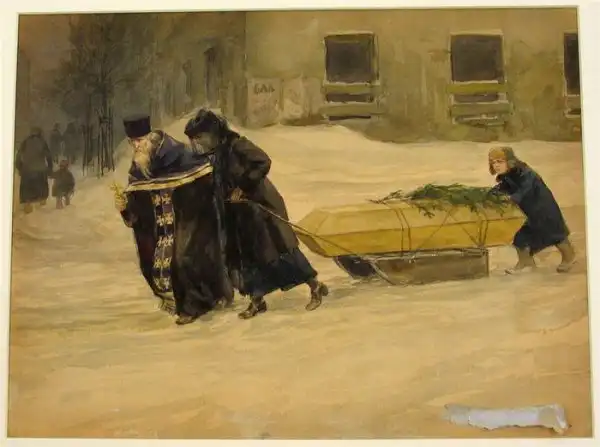 Разделывание павшей лошади на набережной Невы. Обратите внимание: на другом берегу какая-то демонстрация с красными флагами.
