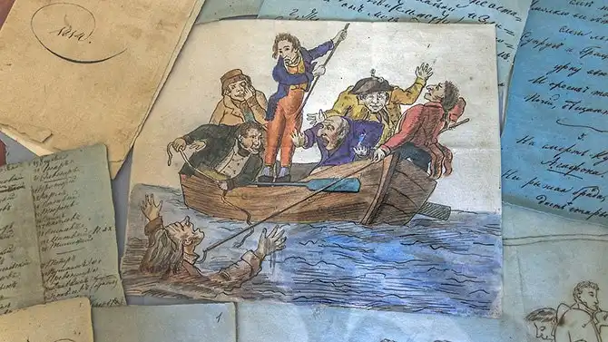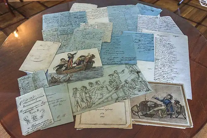 На столе разложены страницы и карикатуры из рукописных лицейских журналов.