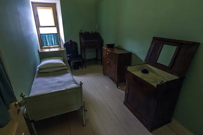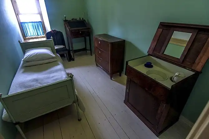 В каждой комнате — железная кровать, стул, конторка, комод, стол для умывания.