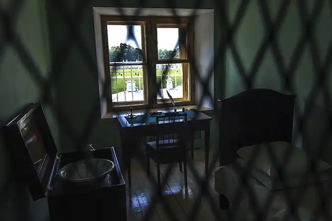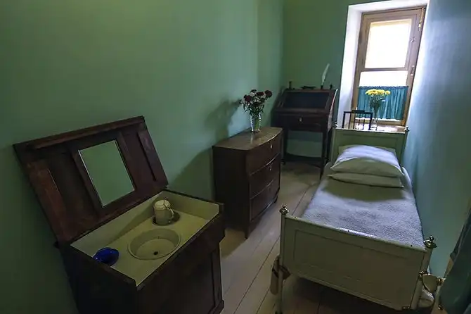 Из-за своего расположения «келья» Пушкина была теснее других. Если у Пущина между стенкой и окном помещается конторка и стул, то у Пушкина — только конторка.