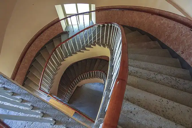 Расположенная в закруглённом торце здания лестница приводит на третий этаж.