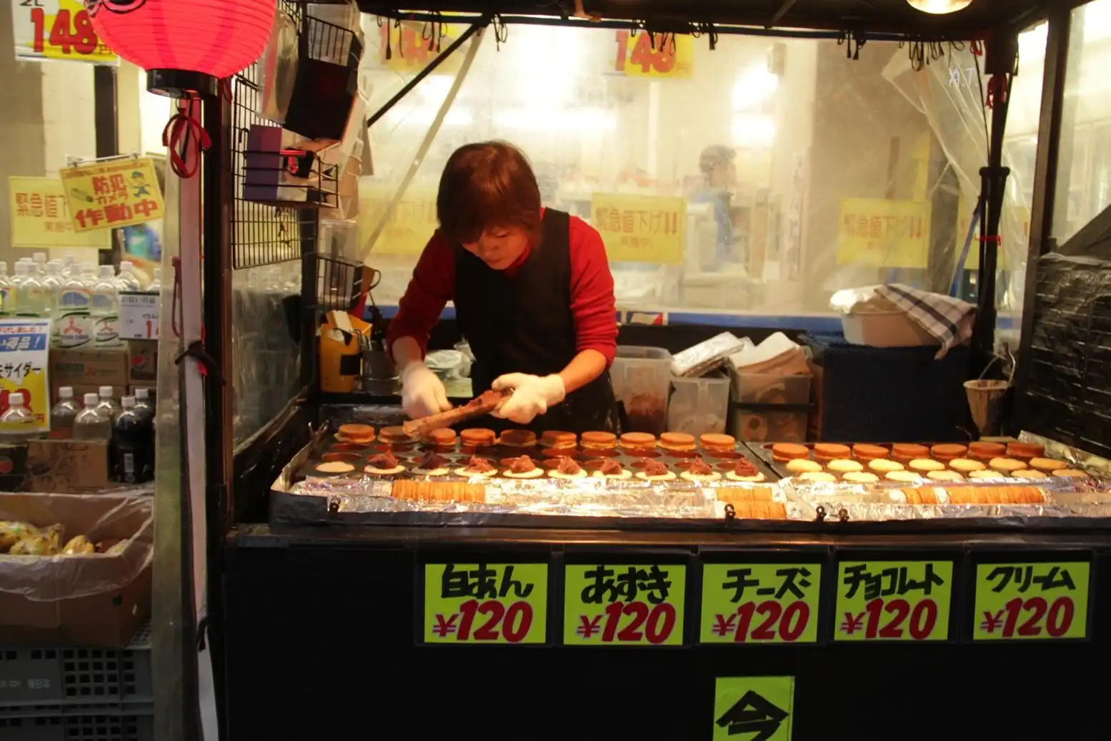Поскольку здоровый интерес есть всегда, то мы пристаем к владелице палатки и пытаемся выяснить что это. Название спустя какое-то время забываем , но увиденные штуки на пробу покупаем. Слева направо читаем вариации начинок: белые бобы, красные бобы, сыр, шоколад, крем. Берем по одной всех, кроме шоколада.