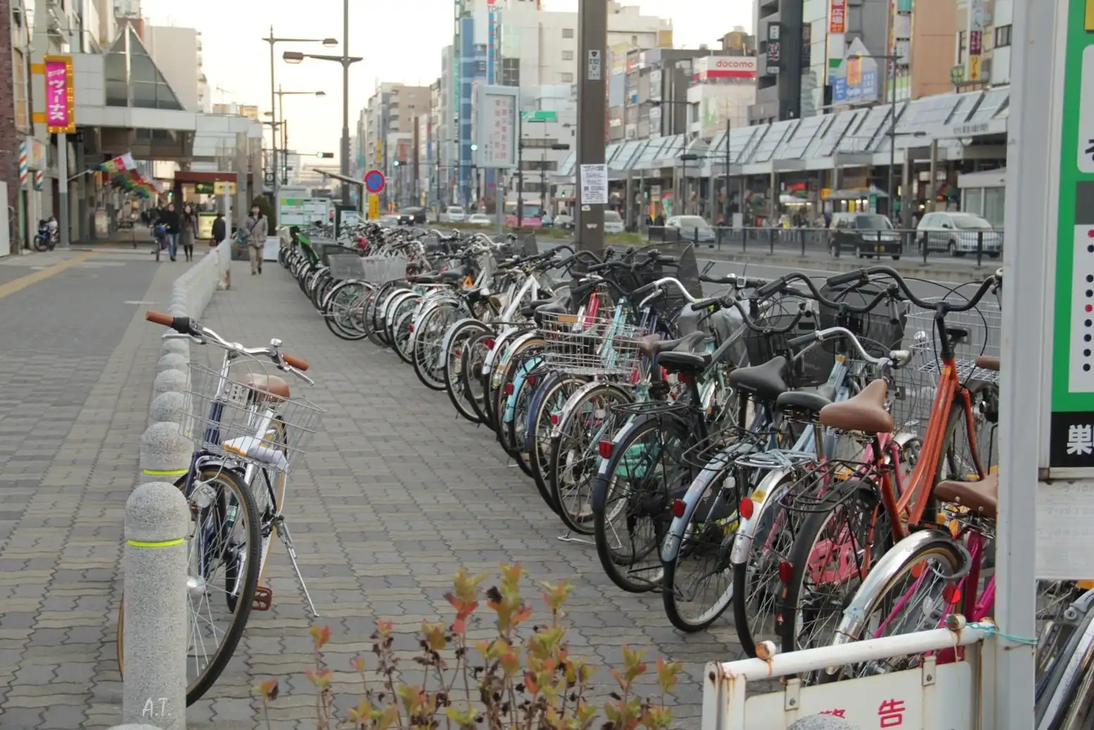 ...Видим стоянку для велосипедов. Велосипеды - очень распространенный транспорт в Японии. Но, если быть честной, то велосипедистов я здесь не люблю и немного побаиваюсь. Местные дороги не имеют полосы для велосипедистов и все они ездят по тротуару. Быть задавленной велосипедом не очень хочется :)