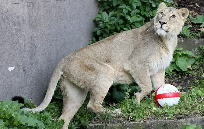 Азиатская львица играет с мячом, раскрашенным в цвета английского флага. Зоопарк в Лондоне.