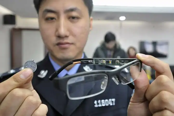 ЕГЭ по-китайски. Полицейский демонстрирует конфискованные высокотехнологичные очки, в Шэньяне, провинция Ляонин, Китай. Таким гаджетом пытался воспользоваться на вступительных экзаменах один из поступавших в национальный колледж.